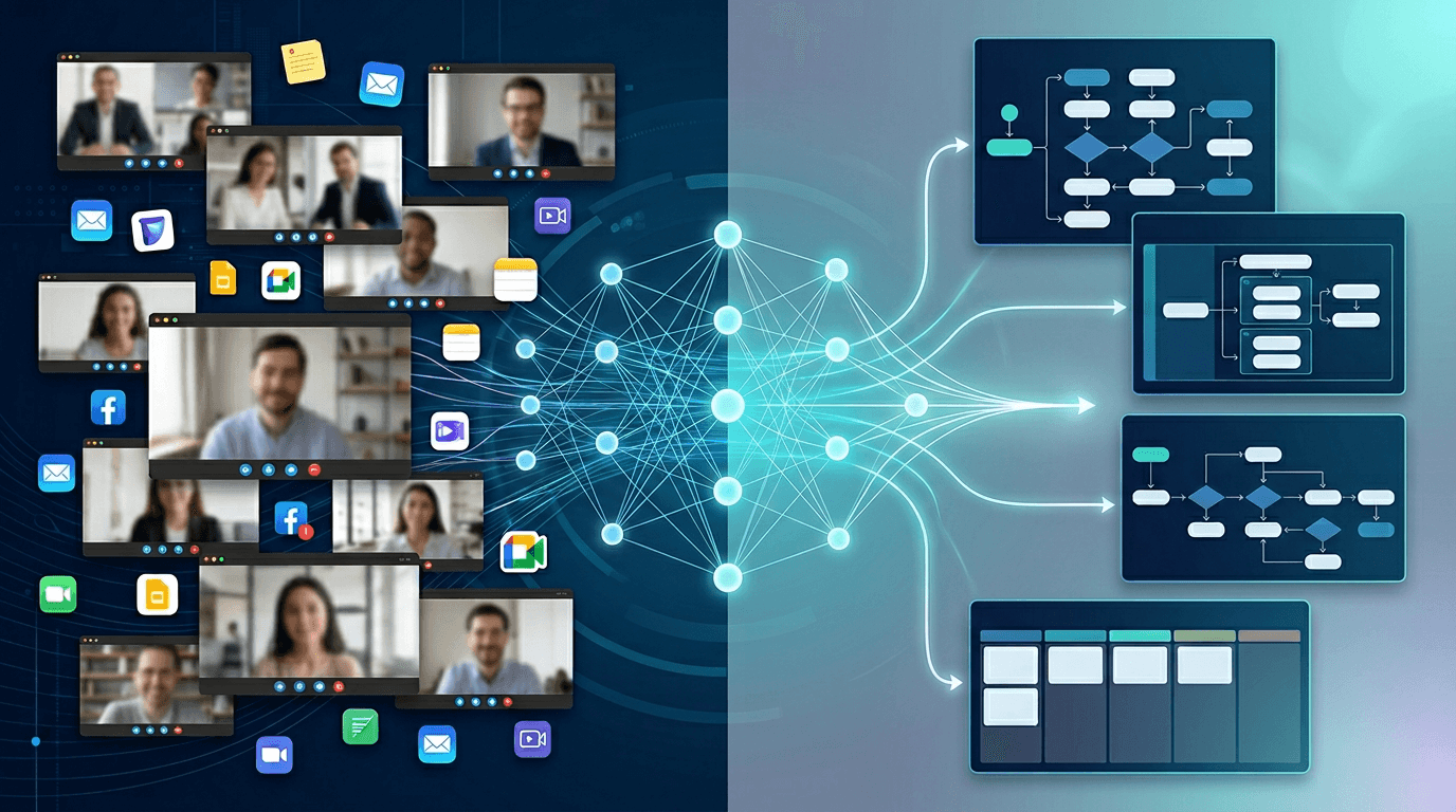 SOP tools capture screens but miss logic; BPM requires specialists; transcription ignores visuals. None connect multimodal inputs into end-to-end flows. Multimodal AI changes that, processing video/audio simultaneously to extract steps, branches, roles, and screenshots.
